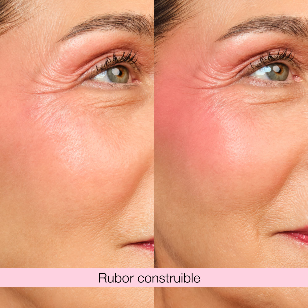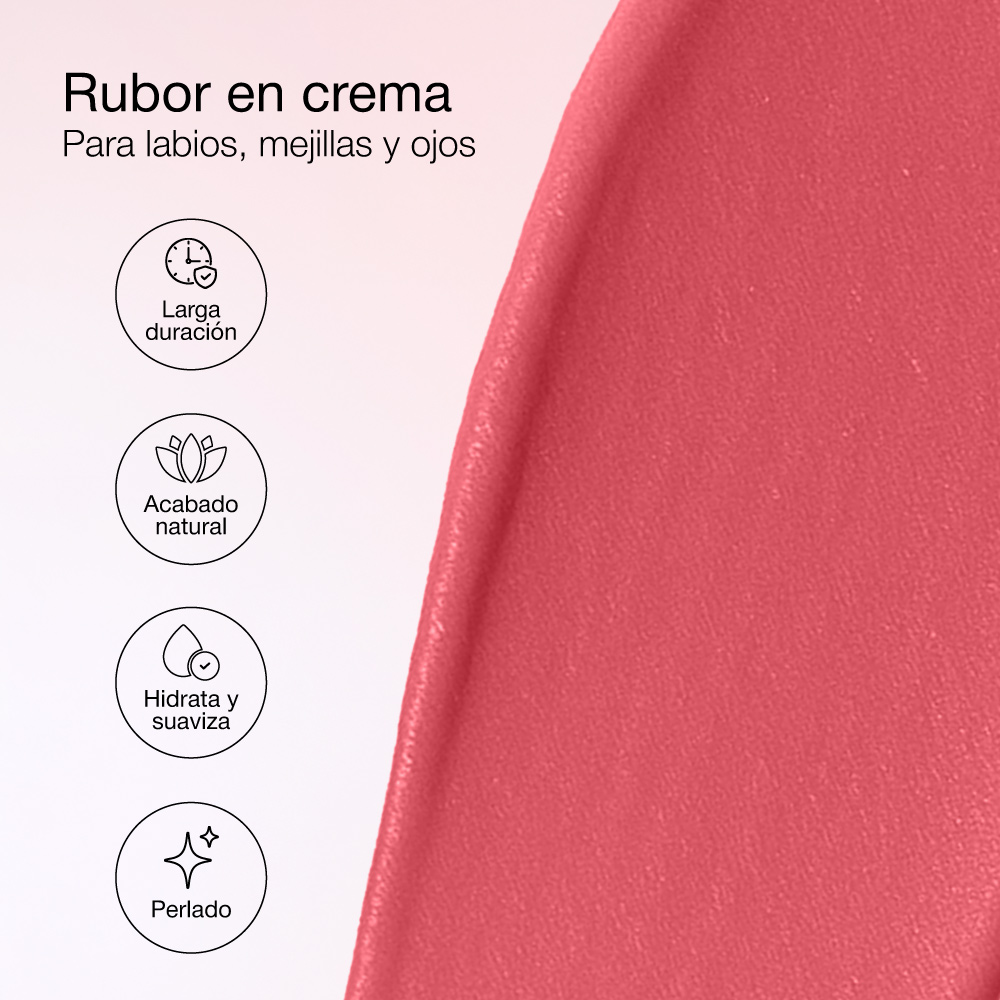 • Blush en crema 3 en 1 que funciona como labial, rubor y sombra.