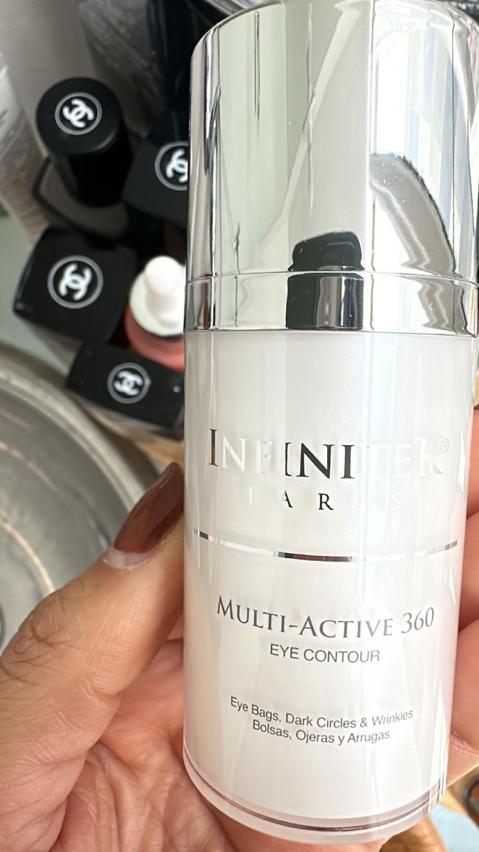 Multi-Active 360 Contorno de Ojos. Reafirma, ilumina e hidrata, mientras previene y disminuye la apariencia de ojeras, bolsas y arrugas. Gracias a su poder nutritivo y reparador brinda una sensación de relajación a los ojos cansados, revelando una mirada reluciente, fresca y juvenil.