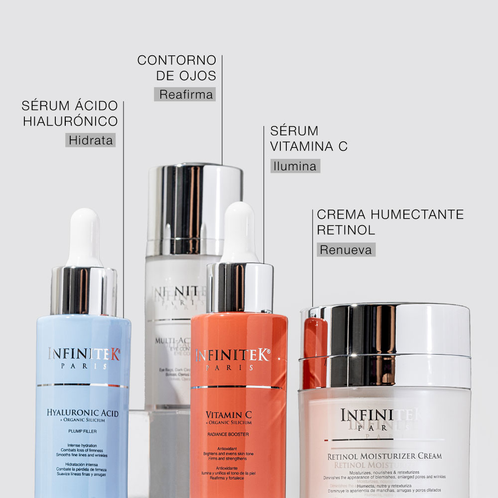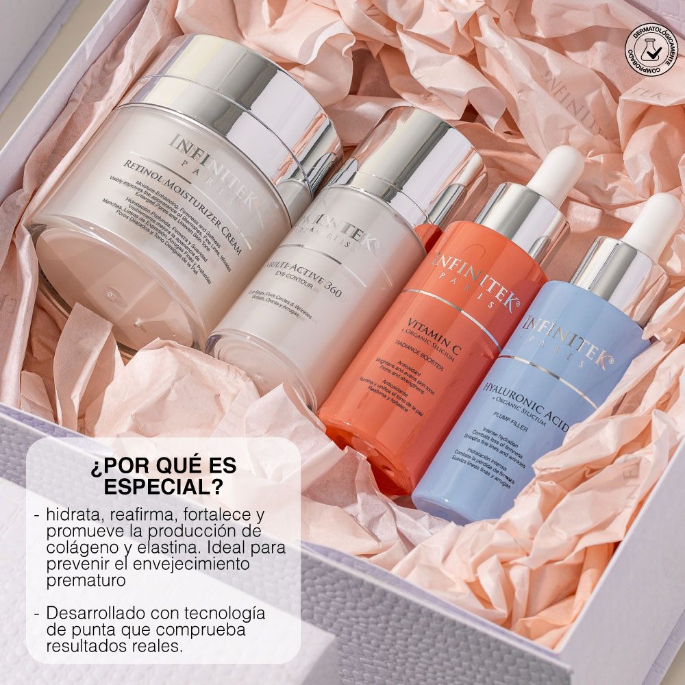 ¡Ideal para todo tipo de piel! Nuestro Kit Facial hidrata, reafirma, fortalece y promueve la producción de colágeno y elastina. Ideal para prevenir el envejecimiento prematuro, contiene Sérum Ácido Hialurónico, Sérum Vitamina C, Multi Active 360 Contorno de Ojos, Protector Solar SPF 50 y Crema Hidratante Retinol. ¡Tu piel lo amará!