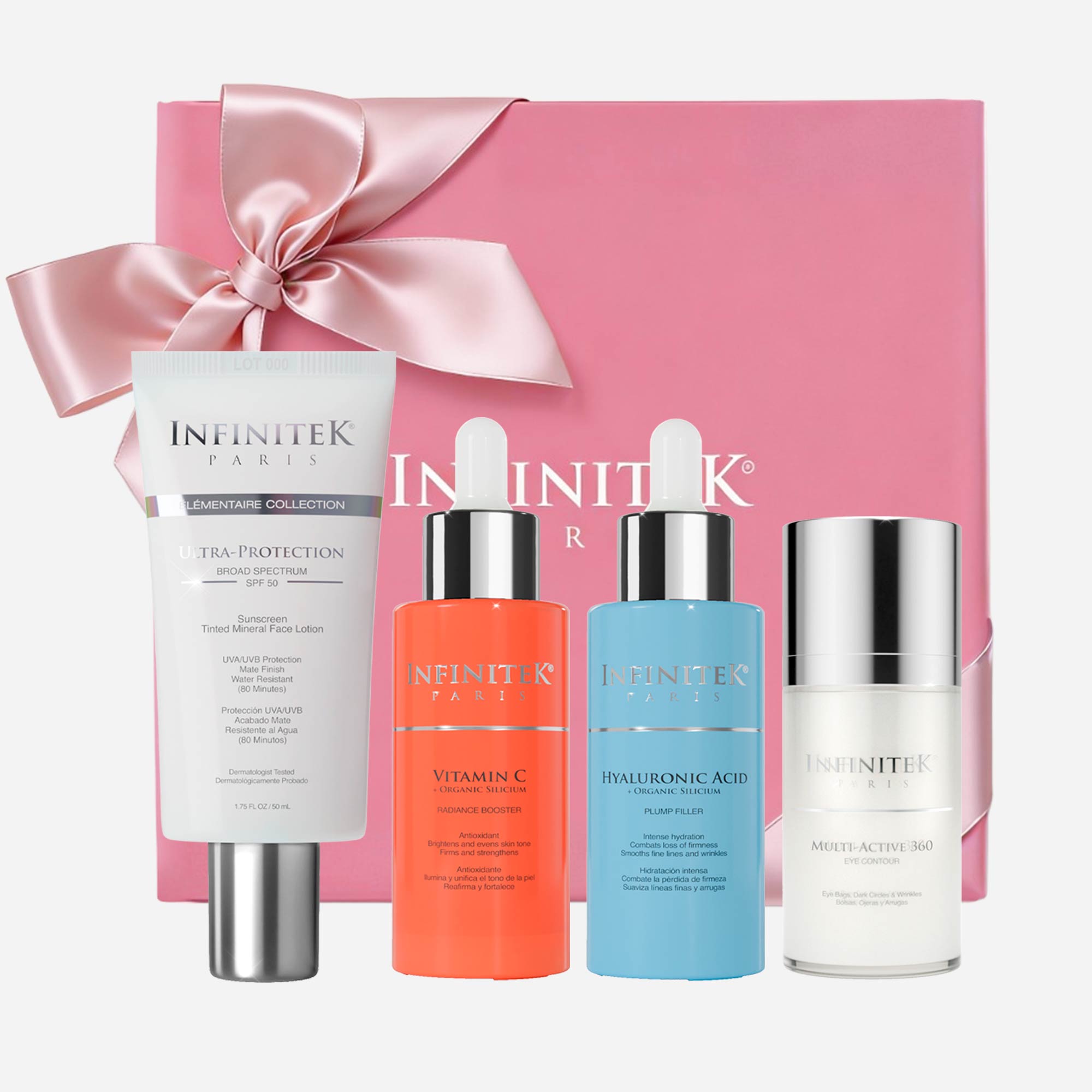 Desarrollado bajo los estándares de Infinitek Paris, este kit combina activos esenciales como Vitamina C, Ácido Hialurónico y protección solar SPF 50, que ayudan a mejorar la apariencia de la piel, mantener la hidratación y protegerla frente a los factores externos del día a día. El Contorno de Ojos Multi-Active 360 complementa la rutina ayudando a suavizar los signos visibles de cansancio en la mirada.