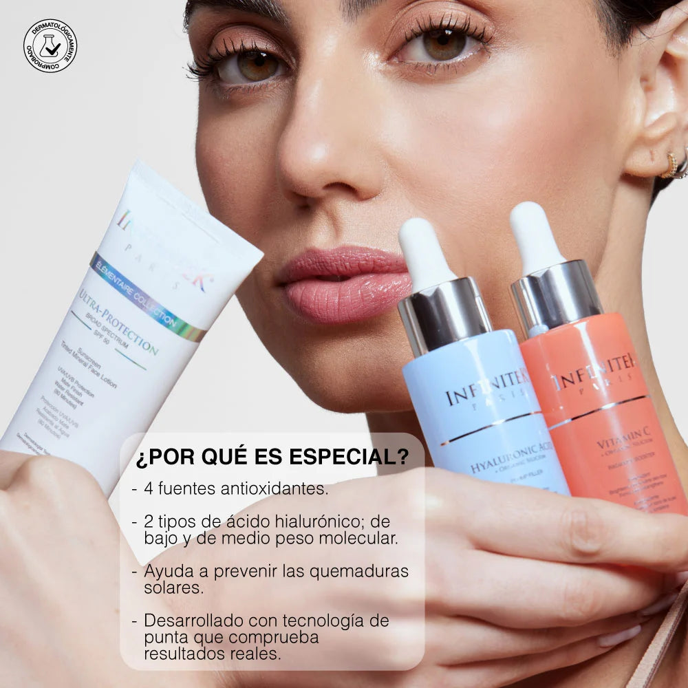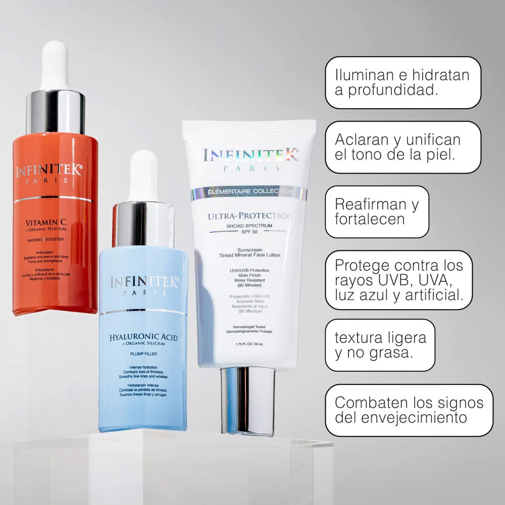 Protector Solar Ultra-Protection SPF 50: Fórmula 100% mineral, brinda una protección de amplio espectro contra los rayos UVA, UVB y Luz Azul, previniendo y mejorando los signos del envejecimiento como arrugas, manchas, y el riesgo de cáncer de piel. Funciona como Primer Facial – Acabado Mate y resistente al agua (80 minutos).