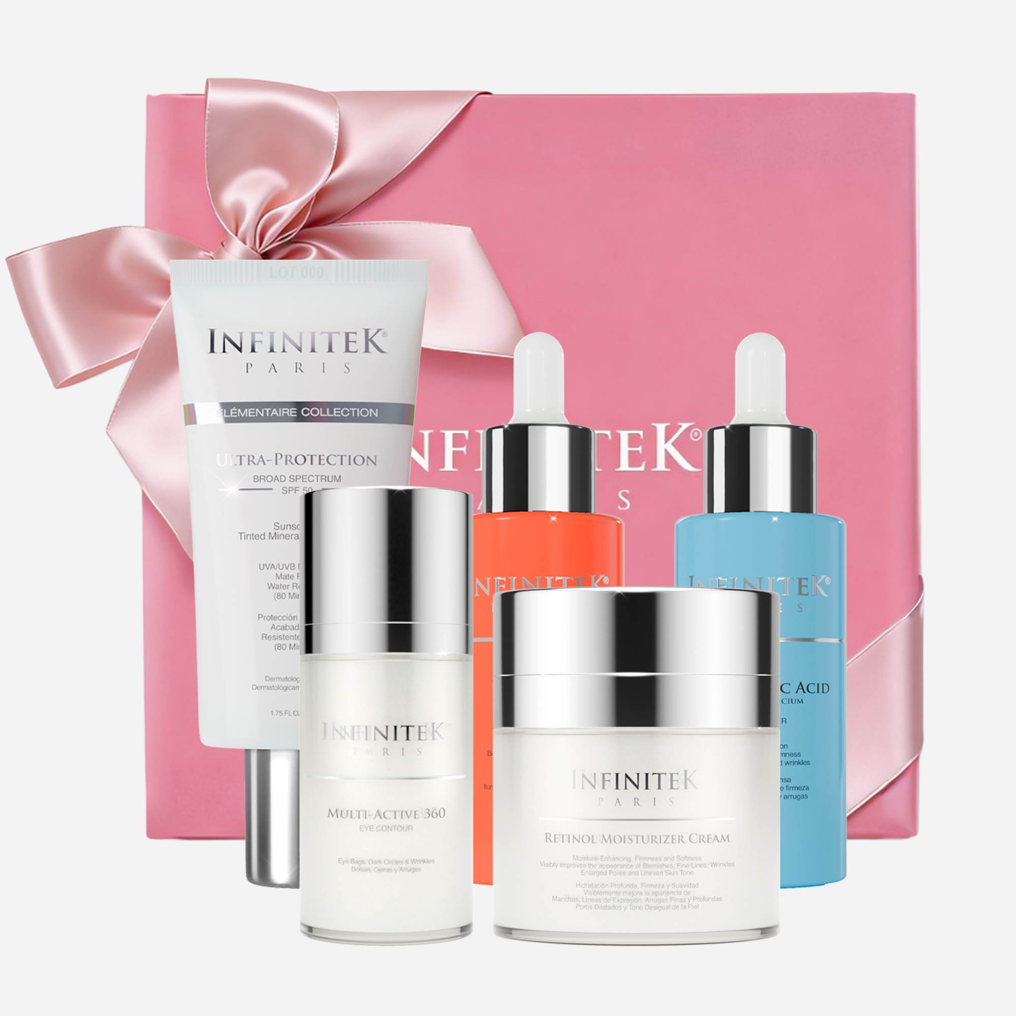 Gracias a la acción combinada de Vitamina C, Ácido Hialurónico y Retinol, este kit contribuye a mejorar la textura de la piel, unificar el tono y aportar una apariencia más firme y equilibrada. El Contorno de Ojos Multi-Active 360 ayuda a suavizar los signos de cansancio en la mirada, mientras el protector solar SPF 50 protege la piel frente a la radiación solar y ayuda a prevenir el fotoenvejecimiento.