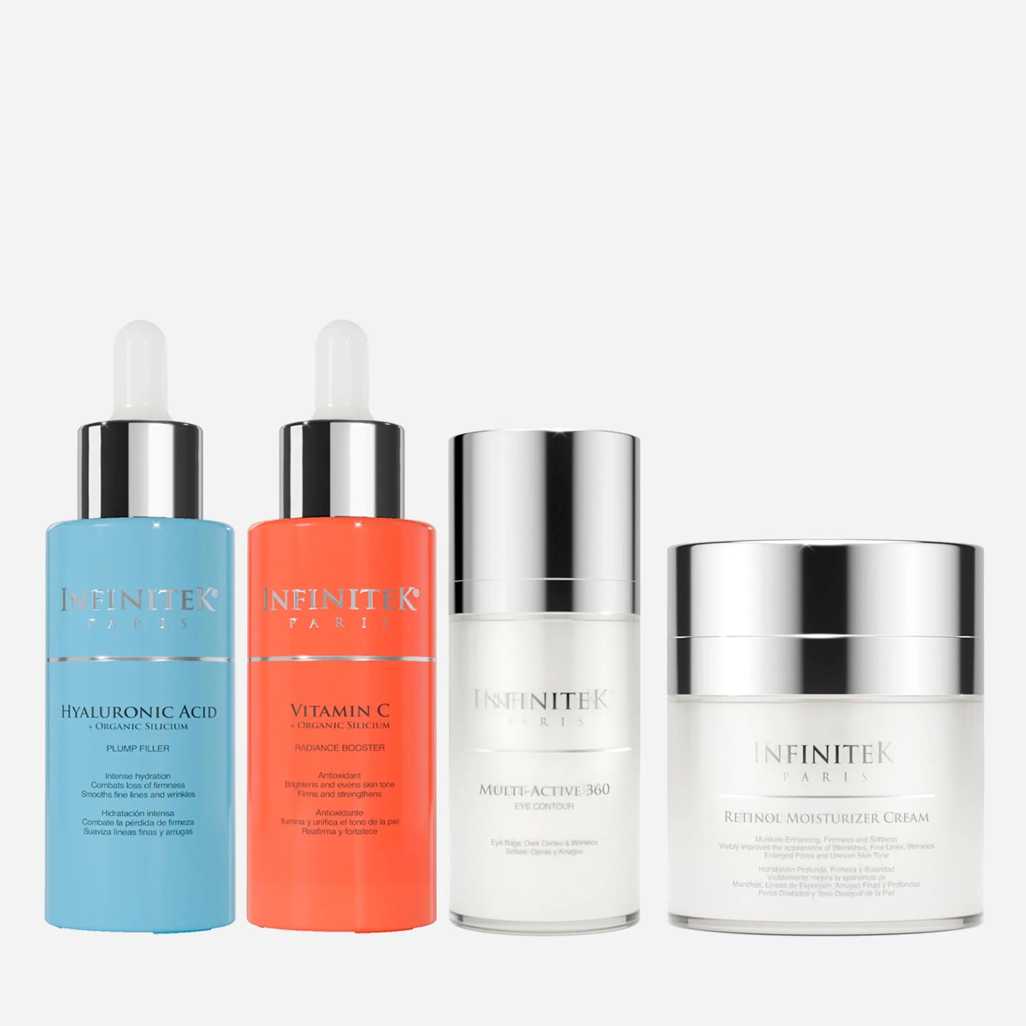 ¡Ideal para todo tipo de piel! Nuestro Kit Facial hidrata, reafirma, fortalece y promueve la producción de colágeno y elastina. Ideal para prevenir el envejecimiento prematuro, contiene Sérum Ácido Hialurónico, Sérum Vitamina C, Multi Active 360 Contorno de Ojos y Crema Hidratante Retinol. ¡Tu piel lo amará!