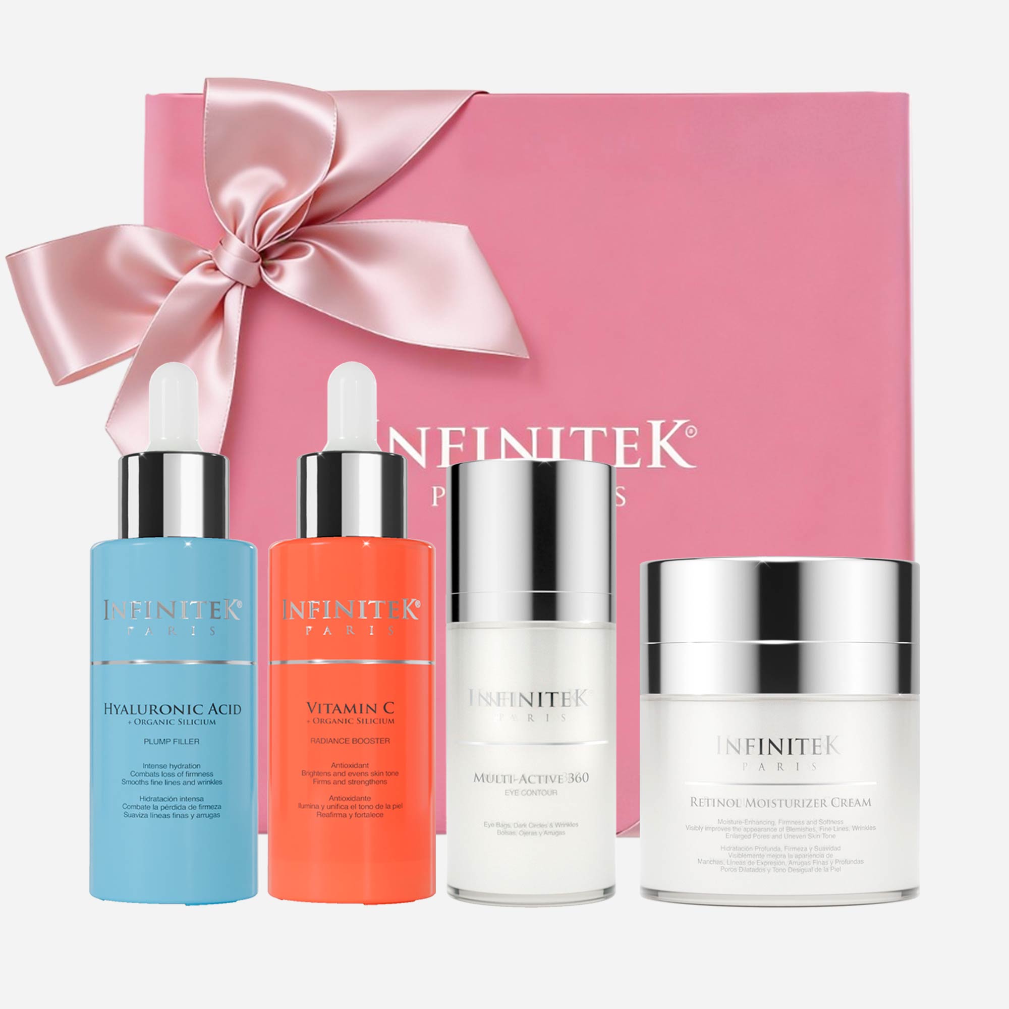 ¡Ideal para todo tipo de piel! Nuestro Kit Hidratación Profunda hidrata, reafirma, fortalece y promueve la producción de colágeno y elastina. Ideal para prevenir el envejecimiento prematuro, contiene Sérum Ácido Hialurónico, Sérum Vitamina C, Multi Active 360 Contorno de Ojos y Crema Hidratante Retinol. ¡Tu piel lo amará!