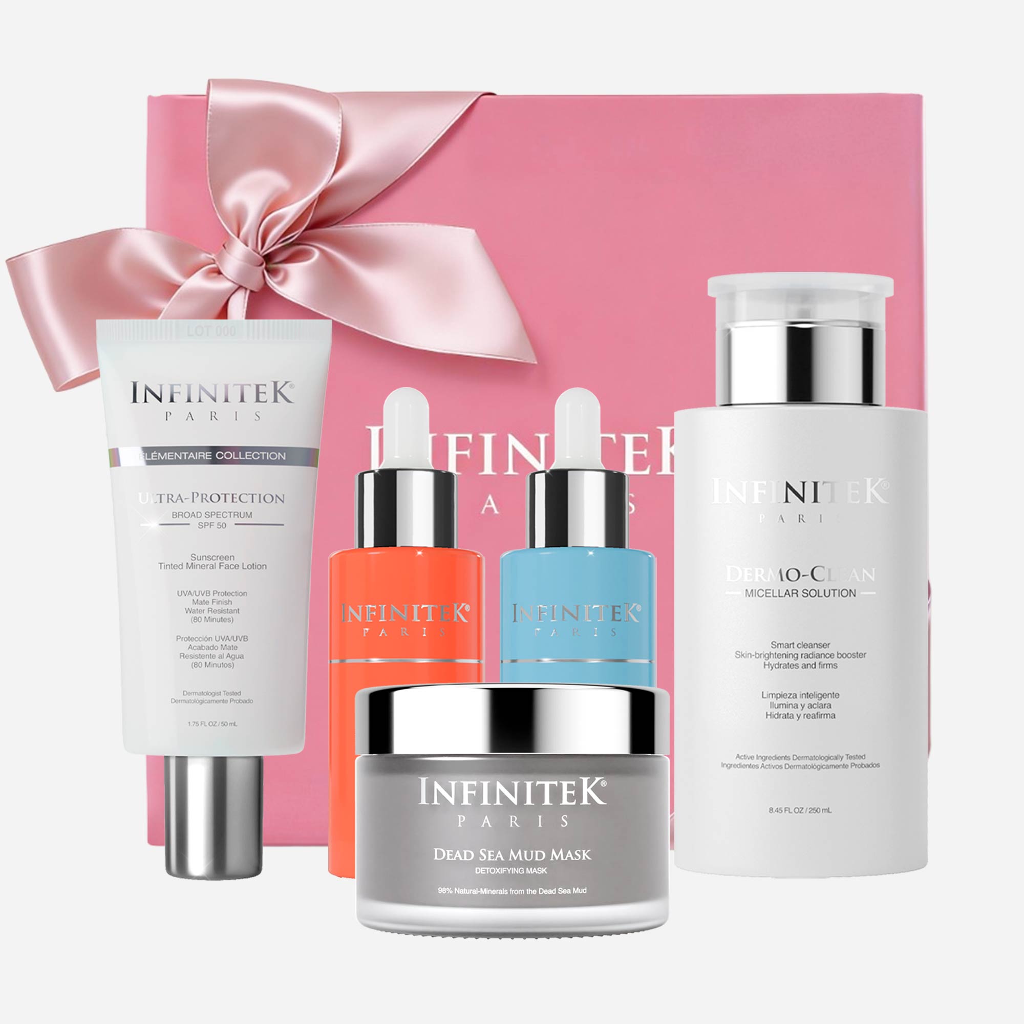 Protector Solar Ultra-Protection SPF 50. Fórmula 100 % mineral, brinda una protección de amplio espectro contra los rayos UVA, UVB y luz azul, previniendo y mejorando los signos del envejecimiento como arrugas, manchas y el riesgo de cáncer de piel. Funciona como Primer facial —acabado mate y resistente al agua (80 minutos).