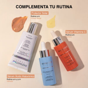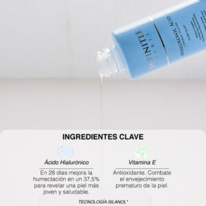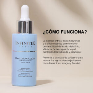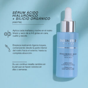 Sérum Ácido Hialurónico + Silicio Orgánico. Brinda una hidratación intensa y duradera, combate la pérdida de firmeza, aumenta la producción natural de colágeno. Disminuye y previene los signos del envejecimiento como arrugas, líneas de expresión y flacidez. Mejora la textura y el grosor de la piel.