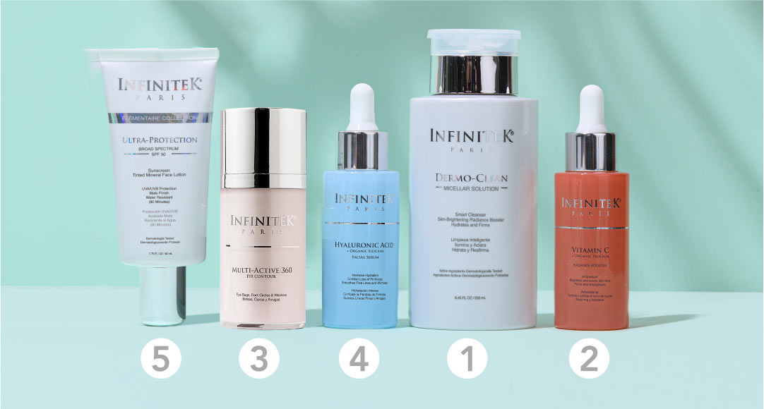 - ¡El paso más importante! No olvides aplicar nuestro Protector Solar Ultra-Protection SPF 50 para prevenir el envejecimiento prematuro y proteger tu piel de los rayos UVB, UVA y luz azul y artificial.